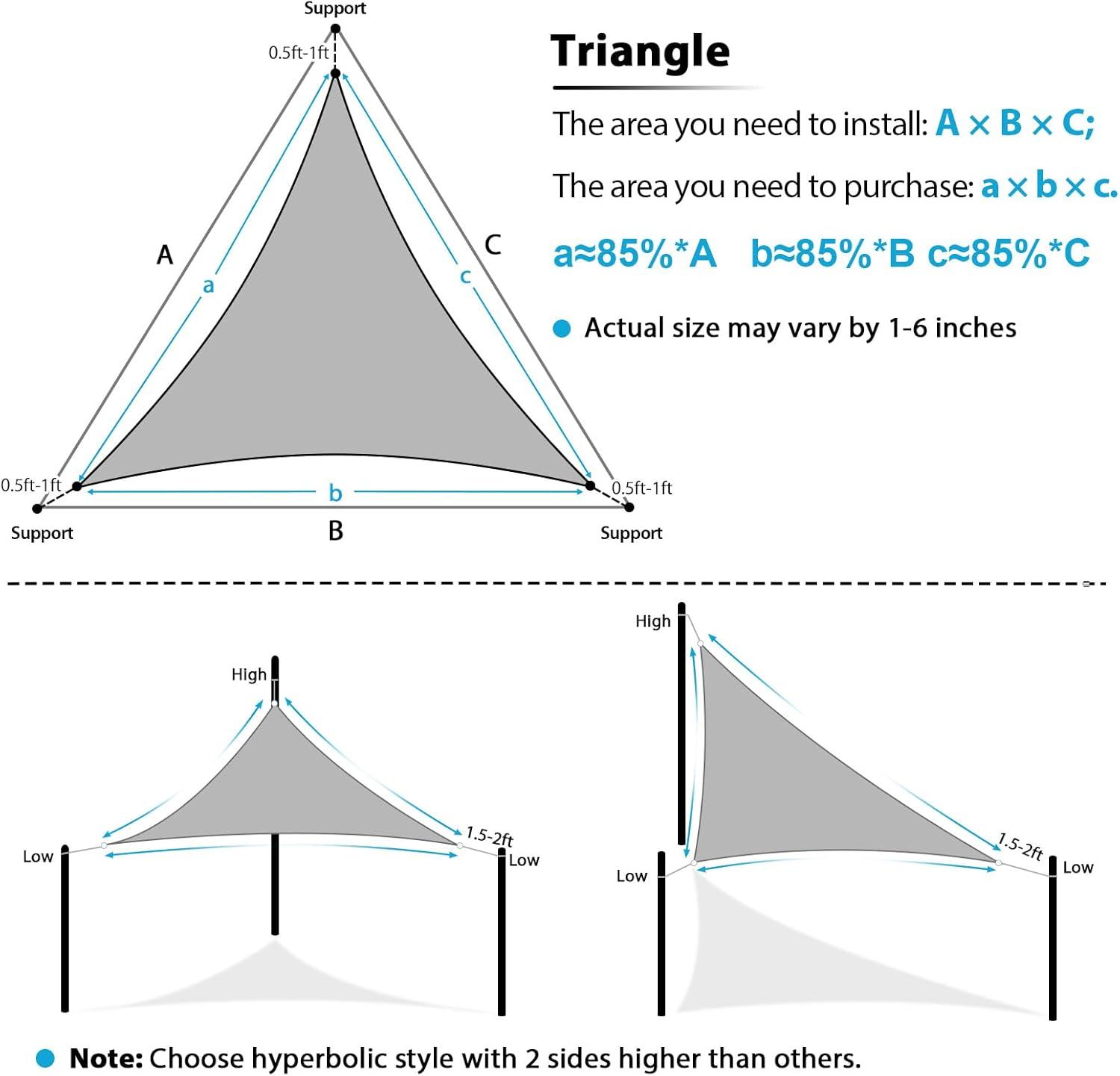 Installation & Measurement: Shade sail measurements are taken from D-ring to D-ring. Leave a 1.5 to 2-foot gap during installation for proper tension. A ±4-inch deviation may occur due to material characteristics