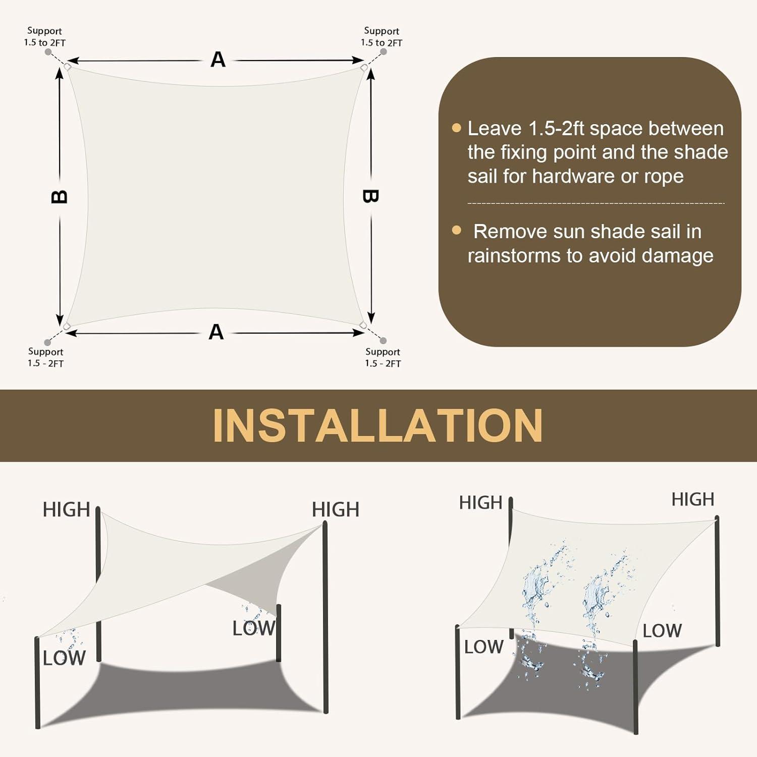Measurement and Installation: Install the shade sail at a 20-40 degree angle with maximum tension for proper water runoff and to prevent pooling. Leave a 1.5 to 2-foot gap between the mounting points and D-rings. Measurements are taken from D-ring to D-ring.